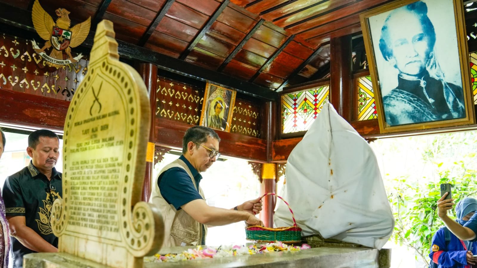 “Di sinilah tempat pemakaman dari salah satu pahlawan nasional, tokoh pejuang besar yang berasal dari Aceh, yaitu Cut Nyak Dien. Beliau merupakan salah seorang pemimpin Perang Aceh sekaligus tokoh yang sangat fenomenal, yang mana kita tahu perjuangannya yang gigih, terutama dalam melawan imperialisme – kolonialisme Belanda di Aceh,” ungkap Menbud Fadli.